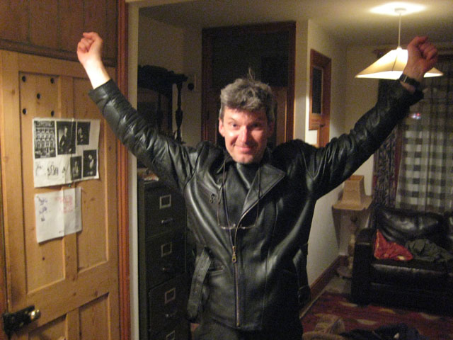 Summaries: total miles 788 Fery: £180 accommodation €85 petrol €85 (that was a cheap trip). Here I am back home after riding through dark Suffolk and Cambridgeshire. H was there cooking for Gam and took this triumphant photograph.