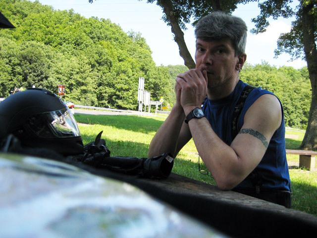 I'm sitting in a pleasant rest area by the roadside, shaded by woods. I'm sure I caught a waft of brewing coffee just then. The air is thick with motorbikes like mosquitos, their riders drawn to the magnet of the Nurburgring race track that I rode by - but not on. My first youth hostel was ok-ish. There's something about being alone but pressed up against crowds that is a bit depressing and makes me prone to feeling more self-conscious than I like to be and rather uptight. I like being alone but the environments so far I have not found relaxing.