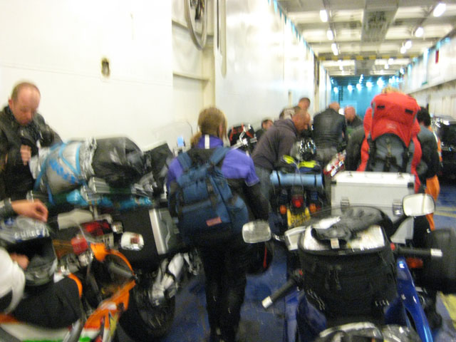 My mileage today was 176.7 miles. A bunch of five 'Chimera', riding Lithuania plates on real old customs, brownish leathers, matt black helmets, really noisy bikes pulled onto the ferry ahead of me. The are sitting with their shaved heads and cans of Heineken almost in silence, over on a table near me, just looking around. Are they criminals or just hard? Lithuania is a long ride from Holland. They certainly are cool and forbidding. Then there is a tall German and his shorter rather lovely partner riding a big R1200gs (he told me it weighs 280kg unladen but I don't think this can be right). They have a huge amount of luggage strapped on the back including a camping table and chairs. In contrast to them is a very down to earth, old school Englishman on an ancient Honda 250, wearing an old hoodie for a jacket, also carrying camping equipment including a tin mug strapped to the back. I wonder how far he has gone.