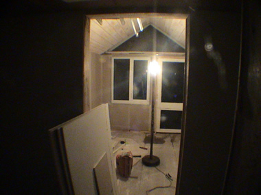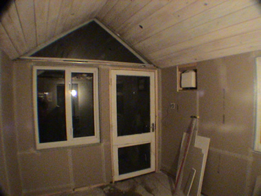 Light at last. Note the neat fuse box. All my cabling is now hidden. There is one 13a ring, one lighting circuit, one cicuit just for the electric shower and one circuit for the sauna stove.
