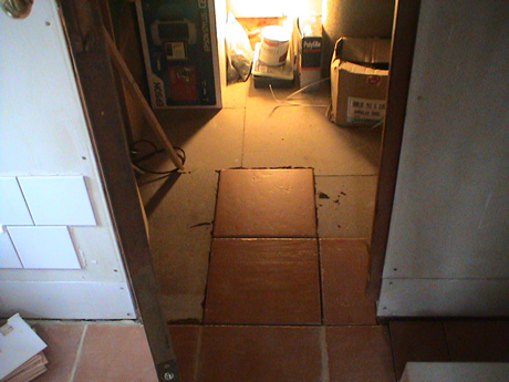 carefully glued wall tiles and cutting out sections of bathroom wall,